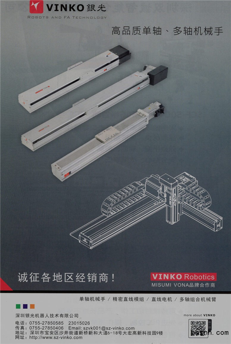 深圳銀光機器人技術有限公司 (簡稱:銀光 / VINKO) 是一家專注于工業機器人和自動化領域研究和開發的高新技術企業。2009年,銀光率先在國內開發出單軸、多軸機械手臂,經過多年潛心研究和技術積淀,銀光已經成為國內單軸機械手臂和直角坐標機器人中高端知名品牌。產品在富士康(Foxconn),華為(Huawei),比亞迪(BYD),美的(Midea)等知名企業及其自動化設備供應鏈中占據領先地位。"品質過硬+貼心服務"成為銀光人對客戶和市場最深刻的理解,同時也是最樸素的追求。作為中國單軸、多軸機械手臂的領導者和標桿品牌,銀光期望通過更多高品質的產品和服務為中國自動化核心零部件做出貢獻。