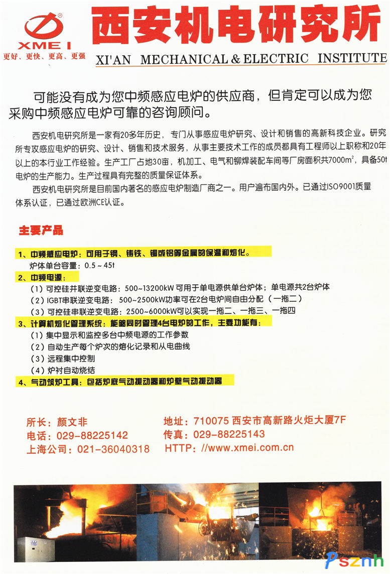 西安機電研究所成立于1987年,位于西安高新技術產業開發區,是一家專業從事感應熔化和加熱設備及其供電裝置的研究,產品設計,生產制造,安裝調試,維修及技術服務等業務的高新技術企業,是國內最大的感應電爐制造商之一。企業通過高新技術企業認定,ISO9000 質量管理體系認證,以及歐盟CE安全認證。