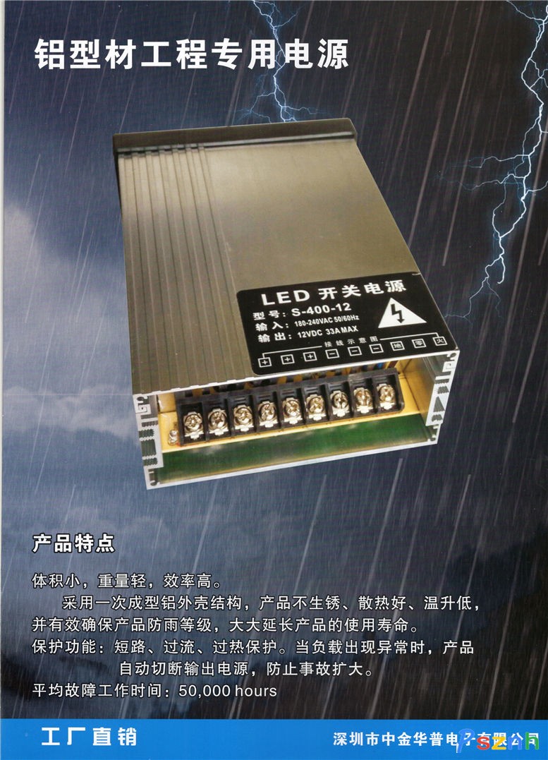 深圳市中金華普電子有限公司是集設計、生產、銷售、服務于一體的專業電源企業。公司成立以來,憑先進的技術,多年的開發、銷售經驗,以完善的品質管理體系、先進的檢測設備、及完善的售后服務,贏得廣大客戶的信賴與支持。目前,本公司已開發和生產有全系列的AC/DC 、DC/DC、DC/AC高頻開關電源。產品廣泛應用于工業自控系統、儀器儀表、大屏幕顯示、計算機設備、通訊設備、防盜系統、醫療設備、軍工等領域。 本公司已經通過ISO9001質量管理體系,保證產品在質量、安全、環保、節能等方面均走在了同行業的前列。產品獲得UL、CE等認證.  本公司備有大量現貨,品種齊全,交貨迅速,愿與一切客戶建立良好的合作關系。并歡迎OEM、ODM。