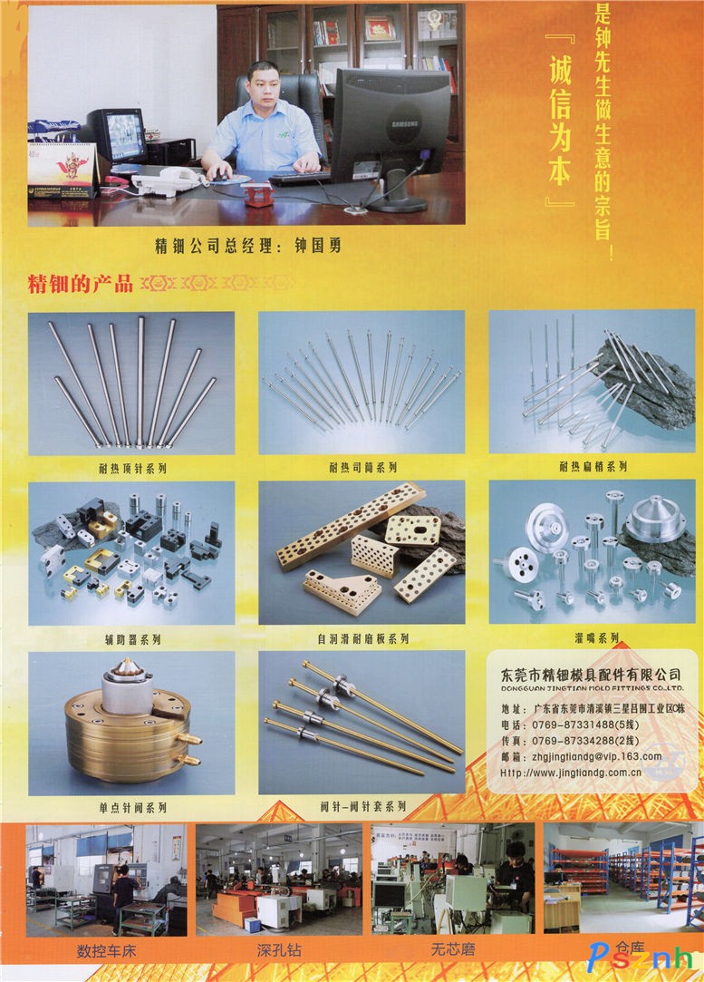東莞市精鈿模具配件有限公司始創(chuàng)于1998年,正式成立于2002年,主要致力于塑膠模具、壓鑄模具、五金模具及熱流道零件的研發(fā)、生產(chǎn)銷售、技術(shù)支持及售后服務(wù)。東莞市精鈿模具配件有限公司不斷為塑膠模具、壓鑄模具、五金模具熱流道零件的標(biāo)準(zhǔn)化、產(chǎn)業(yè)化及產(chǎn)品的通用性、互換性而不懈努力。   隨著中國(guó)出口模具的蓬勃發(fā)展,為匹配出口模具的高品質(zhì)、交期快的需求,自2003年開始,東莞市精鈿模具配件有限公司全力專注于歐洲美國(guó)亞洲品牌標(biāo)準(zhǔn)塑膠模具配件的中國(guó)制造與技術(shù)支持。并能依循國(guó)標(biāo)GB 、日標(biāo)JIS、德標(biāo)DIN、美標(biāo)AISI等國(guó)際行業(yè)標(biāo)準(zhǔn)制作。   在產(chǎn)品多元化的同時(shí),東莞市精鈿模具配件有限公司在生產(chǎn)加工能力、品質(zhì)控制過(guò)程、技術(shù)解決水平、以及整體服務(wù)解決方案方面都有了很大的進(jìn)步與發(fā)展,贏得了客戶的認(rèn)可與信賴。   隨著公司的日益壯大,2009年,公司榮獲了IS09001:2008質(zhì)量標(biāo)準(zhǔn)認(rèn)證并開始拓展海外市場(chǎng)。   我們倡導(dǎo)以高效的、年輕向上的團(tuán)隊(duì)