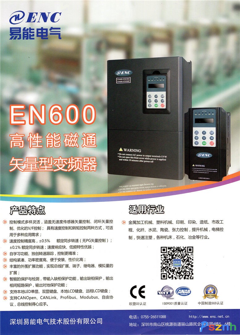 深圳易能電氣技術股份有限公司是一家從事電氣傳動、工業自動化領域內的產品,包括變頻調速、伺服控制器、PLC等產品研發、生產與銷售的高科技民營企業,由留學歸國學者沈鴻等一批專家于2004年創立,公司三遷其地不斷發展擴大,現位于深圳市政府重點扶持的高新科技園區內 — 民企科技園,公司已通過ISO9001:2008質量管理體系認證、歐盟CE認證;榮獲國家創新基金、深圳市戰略新興產業基金、十大國產品牌、深圳高新科研補貼、產品創新獎、最具投資價獎等榮譽,是國家級高新技術企業、深圳市軟件企業、深圳市信息軟件協會會員,是多家行業組織的理事與重要成員。