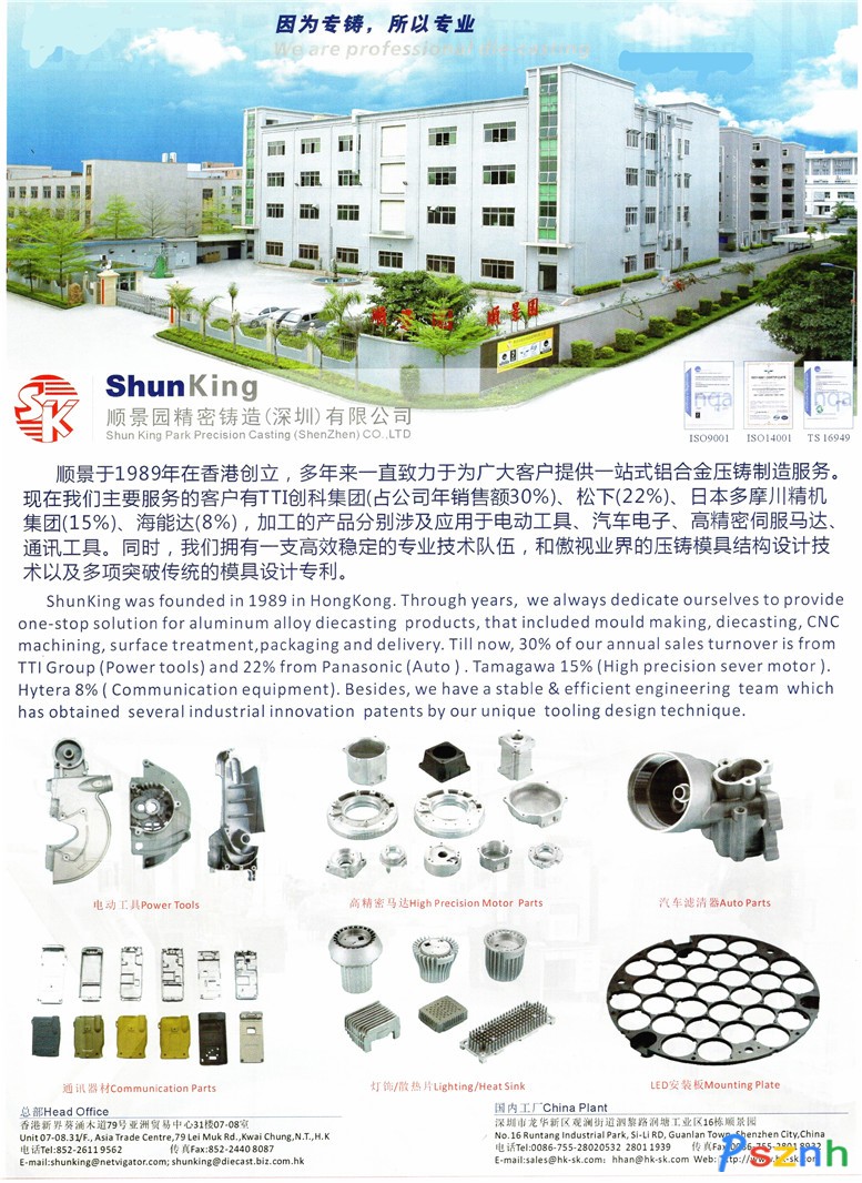 公司2001年通過BSI認(rèn)證公司ISO9001:2000質(zhì)量體系認(rèn)證,2007年通過ISO14001環(huán)境管理體系認(rèn)證,2008年通過NQA TS16949管理體系認(rèn)證。公司設(shè)備先進(jìn)、齊全,同時(shí),擁有一支高效穩(wěn)定的專業(yè)技術(shù)隊(duì)伍,和傲視業(yè)界的壓鑄模具結(jié)構(gòu)設(shè)計(jì)技術(shù)以及多項(xiàng)突破傳統(tǒng)的設(shè)計(jì)專利。所加工的產(chǎn)品涉及應(yīng)用于電子、機(jī)械、燈飾、醫(yī)療、汽車等各行各業(yè),能滿足客戶高裝飾性、高精密度的特殊要求。