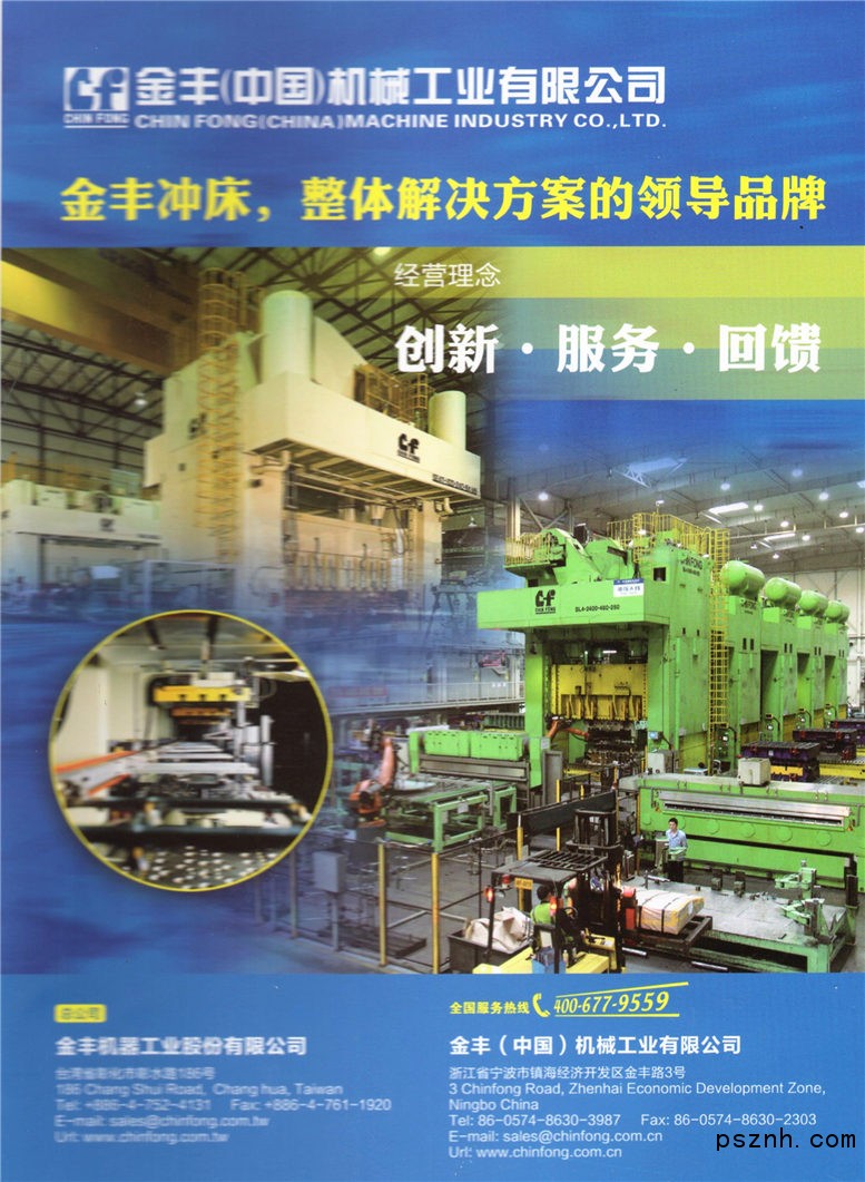 金豐(中國)機械工業有限公司生產的鍛壓機械產品系以母公司的設計圖紙、生產工藝和技術、管理體系為藍本,與母公司進行同步生產壓力機。自1996年投產以來,通過了出口產品質量許可證及ISO-9001:2000版國際品質認證。同時為迎接高性能、高自動化時代的來臨,公司全部采用來自日本、臺灣之大型、高效、精密之生產設備,并以此來穩定及提升產品品質,產品涵蓋2400噸級以下開式、閉式、高速、冷熱鍛各種類型機械式沖床,主要客戶有天津豐田汽車、南昌江鈴汽車、章丘海爾、深圳富金、美國STAMTEC等公司。