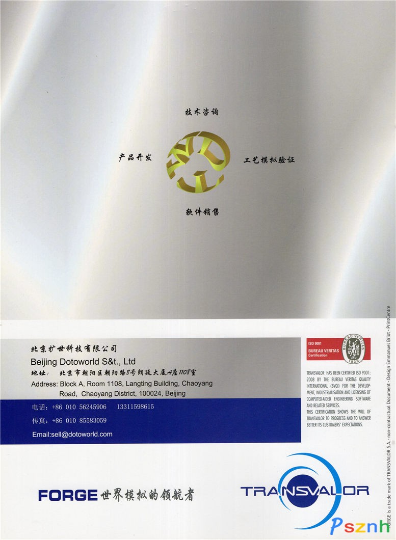 1. 主要致力于鍛造模擬軟件的開發(fā)完善,并在中國大陸銷售Transvalor系列軟件,并負(fù)責(zé)相關(guān)軟件售后服務(wù),我公司在售軟件包括Forge2009、 Forge2011、Thercast、Coldform。其中Forge2011所有模塊已經(jīng)由我公司完成了漢化,操作者很快就能掌握這個(gè)軟件的操作應(yīng)用。最新版本為FORGE@NXT1.1