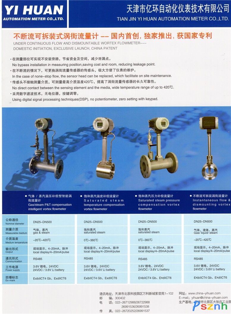 天津億環(huán)儀表公司從業(yè)20年來一直致力于流量計的開發(fā)和生產(chǎn),其中自主研發(fā)的不斷流可拆卸式渦街流量計,已獲國家專利,是目前國內唯一一款可測最高介質溫度達到420℃的渦街流量計。