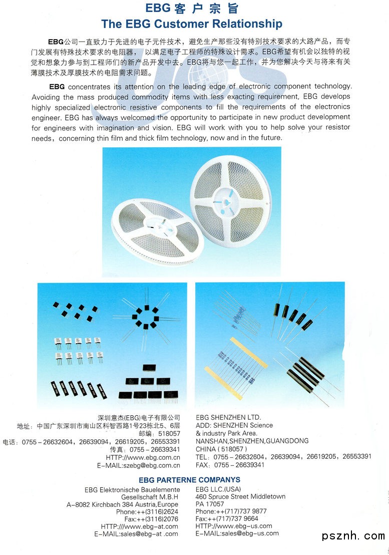深圳意杰(EBG)電子有限公司是一家中外合資企業.公司成立于1988年,注冊資金300萬美元,由深圳科技園總公司和奧地利EBG m.b.h.公司合資開辦.經過多年的發展,深圳意杰(EBG)電子有限公司已經成長為一家成功的電子元件制造廠商,致力于生產特殊領域要求的電阻器產品,客戶遍及中國、美國及歐洲等多個國家.