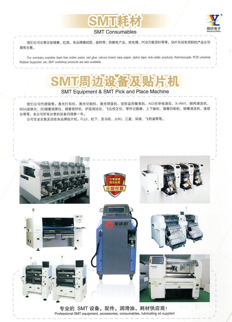 “東莞市揚(yáng)鈴電子商貿(mào)有限公司”位于東莞有“中國鄉(xiāng)鎮(zhèn)之星”之稱的長安鎮(zhèn)。我們成立于2005年,一直從事二手貼片機(jī)買賣,整廠設(shè)備回收,貼片機(jī)吸嘴,飛達(dá),配件,SMT周邊設(shè)備的研發(fā)和生產(chǎn)。并取得了太森潤滑油、捷客斯?jié)櫥汀⒊龉鉂櫥偷氖跈?quán)代理;自公司成立以來,一直與一些知名優(yōu)秀供應(yīng)商緊密合作,為OEM及EMS工廠提供先進(jìn)的生產(chǎn)設(shè)備、零配件、耗材及潤滑油。