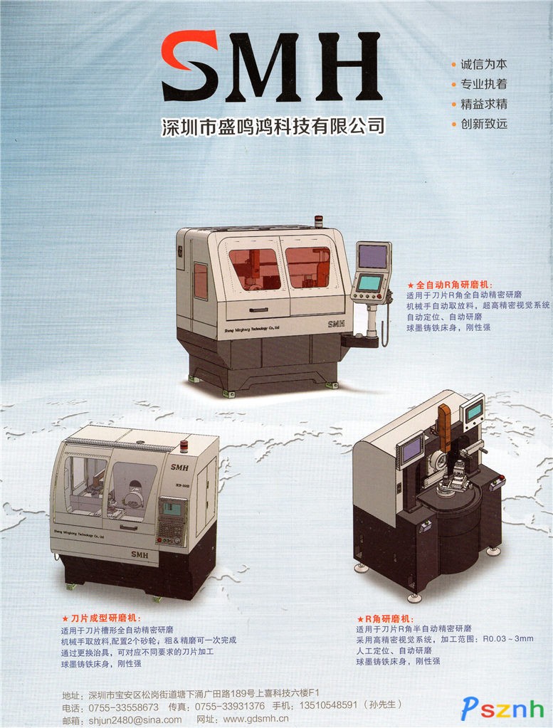 深圳市盛鳴鴻科技有限公司是集設計、生產、銷售、服務為一體的自動化設備制造企業,自2008年跨入數控刀具行業,一直專注于刀具行業自動化設備的研發和制造。公司以磨床為中心,結合客戶需求,提供各種機床、自動化設備及先進工裝夾具。主要產品:數控刀片溝槽研磨機、R角研磨機、刀片倒棱機、砂輪修整機、刀片周邊磨床、及銑刀鉆頭精密檢測設備等。適用于硬質合金、金屬陶瓷、PCBN(立方氮化硼)、PCD( 聚晶鉆石)行業的精密數控刀具。