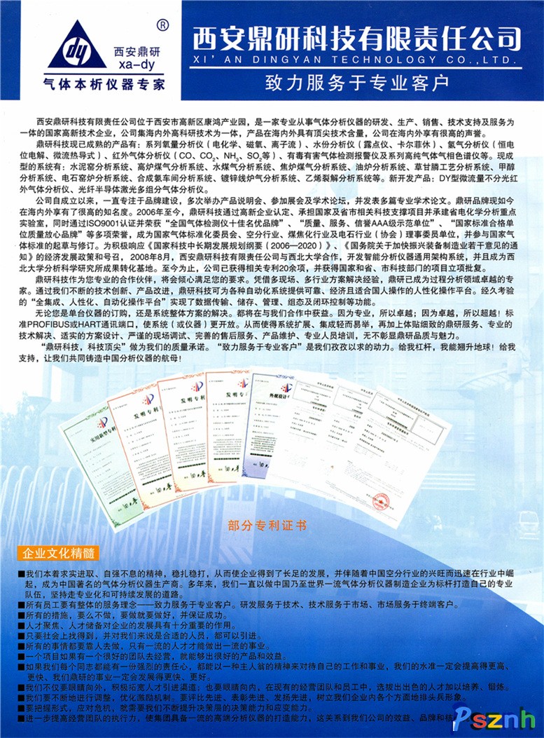 公司自成立以來,一直專注于品牌建設,多次舉辦產(chǎn)品說明會、參加展會及學術論壇,并發(fā)表多篇專業(yè)學術論文。鼎研品牌現(xiàn)如今在海內(nèi)外享有了很高的知名度。2006年至今,鼎研科技通過國家級高新企業(yè)認定、承擔國家級科技支撐項目并承建省級電化學分析重點實驗室,同時通過ISO9001認證并榮獲"全國氣體檢測儀十佳名優(yōu)品牌"、"質量、服務、信譽AAA級示范單位"、"國家標準合格單位質量放心品牌"等多項榮譽,成為國家氣體標準化委員會、空分、煤焦化及電石等協(xié)會理事及委員單位,并參與國家氣體標準的起草與修訂。為積極響應《國家科技中長期發(fā)展規(guī)劃綱要(20062020)》、《國務院關于加快振興裝備制造業(yè)若干意見的通知》的經(jīng)濟發(fā)展政策和號召,2008年8月,西安鼎研科技有限責任公司與西北大學合作,開發(fā)智能分析儀器通用架構系統(tǒng),并且成為西北大學分析科學研究所成果轉化基地。至今為止,公司已獲得國家級專利20余項,并獲得國家和省、市科技部門的項目立項批復。