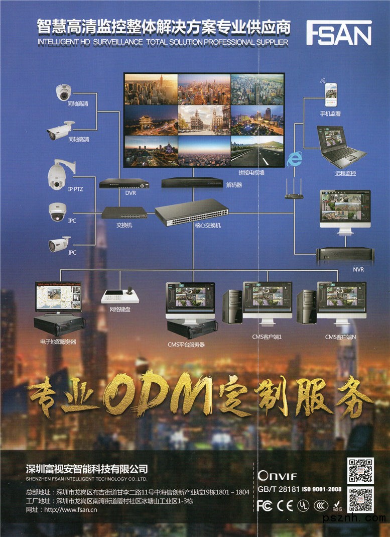 富視安總部位于深圳,在北京、杭州、成都、烏魯木齊設(shè)有四大區(qū)域服務(wù)中心,其服務(wù)網(wǎng)絡(luò)遍布全國二十幾個省區(qū),產(chǎn)品暢銷歐美等100多個國家和地區(qū),自2006年成立以來,連續(xù)6年取得30%以上的高速增長。富視安目前是公共安全協(xié)會副會長單位、深圳市高新技術(shù)企業(yè)、國家高新技術(shù)企業(yè),其產(chǎn)品榮膺2010年度中國安防十大新銳產(chǎn)品稱號。富視安通過了ISO9001質(zhì)量管理體系認(rèn)證,其產(chǎn)品通過了國際通行的CE、FCC嚴(yán)格認(rèn)證,RoHS歐盟綠色環(huán)保認(rèn)證,取得了公安部安防產(chǎn)品檢驗中心頒發(fā)的檢驗報告(MA認(rèn)證)。
