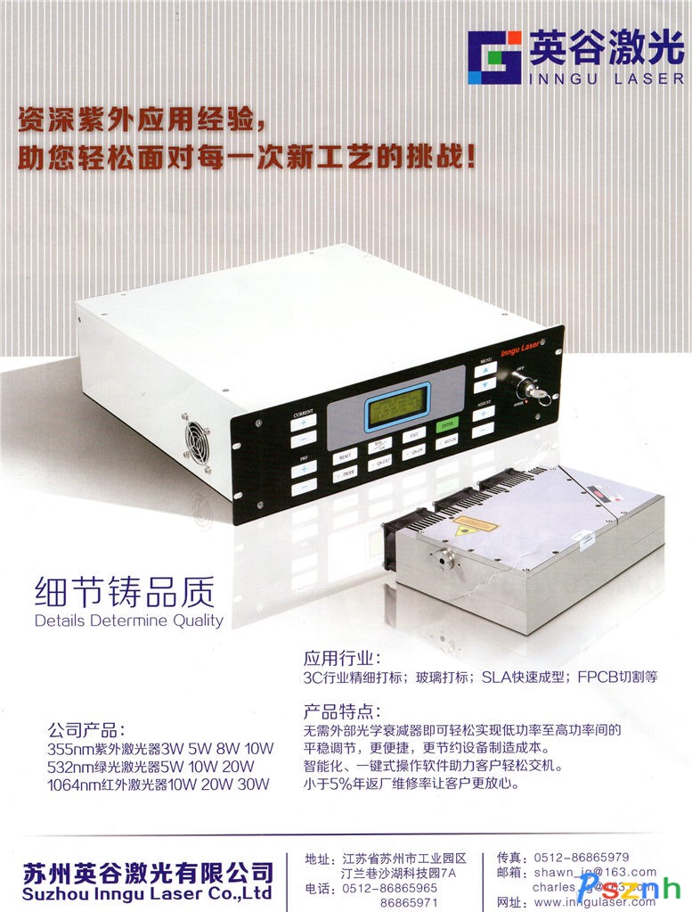 英谷激光所生產的激光器主要應用于各類高端工業激光設備,尤其是基于高功率紫外和綠光激光設備,主要應用于精密加工領域(半導體、激光特種加工、太陽能電池、LED、LCD和觸摸屏等行業)的高端激光加工設備。目前公司擁有一支完整的機械、光學、激光、電子、軟件和工藝專業技術團隊,建有百級超凈試驗室和生產車間。同時,公司還與國內外著名大學、研究機構和相關企業建立了良好的長期合作關系,為英谷激光發展提供強大的技術支持與指導。