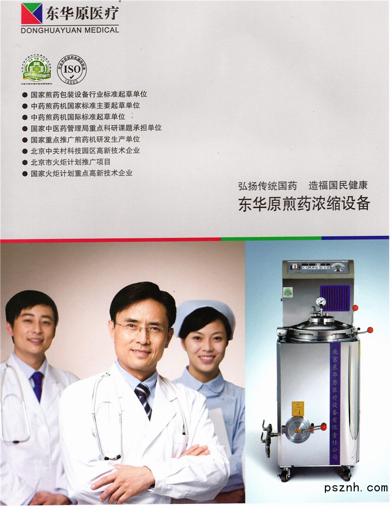 北京東華原醫療設備有限責任公司(以下簡稱“東華原”)成立于2000年,注冊資金2000萬元,坐落于北京市中關村科技園區昌平園,是國家高新技術企業、國家火炬計劃重點高新技術企業。東華原是中國煎藥設備的主流供應商,擁有標準化的煎藥機生產、研發基地,公司自主研制的十功能自動煎藥機被國家科技部認定為國家重點新產品。公司于2005年通過了國家ISO9001質量體系認證和ISO13485醫療器械質量管理體系認證,2007年通過德國萊茵檢測認證、CE產品安全質量認證,產品質量、安全和服務已達到歐盟標準。是煎藥機行業標準、國家標準的制訂單位。由東華原主導起草的國際標準《草藥煎煮設備》已于2015年11月正式發布,這是中醫診療設備領域的第二個國際標準,也是國際標準化組織/中醫藥技術委員會(ISO/TC249)發布的第四個中醫藥國際標準。該標準的發布,為中藥煎藥包裝設備走向世界贏得了話語權。