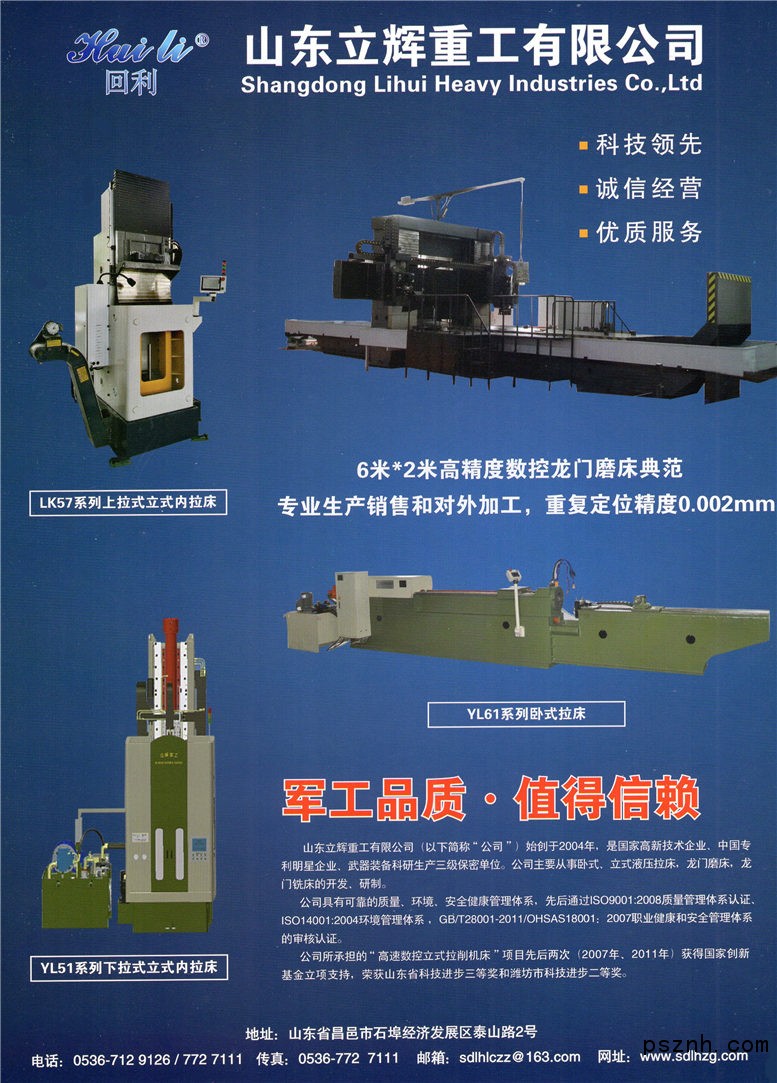 山東立輝重工有限公司(以下簡(jiǎn)稱(chēng)“公司”)始創(chuàng)于2004年,是山東省高新技術(shù)企業(yè)、中國(guó)專(zhuān)利明星企業(yè)、武器裝備科研生產(chǎn)三級(jí)保密單位。公司主要從事臥式、立式液壓拉床的開(kāi)發(fā)、研制、經(jīng)營(yíng)活動(dòng),公司所承擔(dān)的“高速數(shù)控立式拉削機(jī)床”項(xiàng)目先后兩次(2007年、2011年)獲得國(guó)家創(chuàng)新基金立項(xiàng)支持,榮獲山東省科技進(jìn)步三等獎(jiǎng)和濰坊市科技進(jìn)步二等獎(jiǎng)。