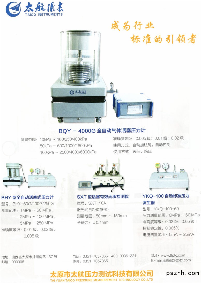 公司匯集了一批經驗豐富的高級專業管理人員、正高級工程師、高級工程師、部聘技師,依托先進的生產設備、完善的工藝流程、可靠的軍工質量保證體系以及國內一流的測試設備生產線,研制、生產有自主知識產權的國際先進水平的壓力測試設備。主要產品有:高精度綜合測試儀、動靜壓檢測儀、大氣數據測試儀;氣體活塞壓力計;標準活塞壓力計;全自動氣體活塞壓力計;氣體全自動標準壓力發生器(全自動壓力控制器),液體全自動標準壓力發生器(全自動壓力控制器);數字壓力表;數字壓力計;氣體手泵、液體手泵;數字氣壓儀、振動筒氣壓儀;空盒氣壓表檢定裝置等。產品廣泛應用于航空、航天、部隊、氣象、計量、礦山、石油、石化、電力、熱力、冶金等行業,享有較高聲譽。