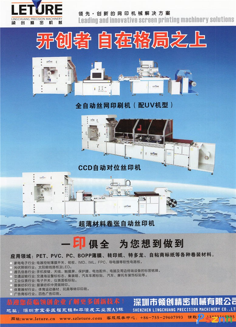 深圳市領(lǐng)創(chuàng)精密機械有限公司是專業(yè)從事全自動絲網(wǎng)印刷機的研發(fā)、制造與銷售的機械設備企業(yè)。具有深圳市工商局營業(yè)執(zhí)照認證書,有專業(yè)操作培訓人員及售后服務。擁有目前最先進的全自動化印刷設備技術(shù)。