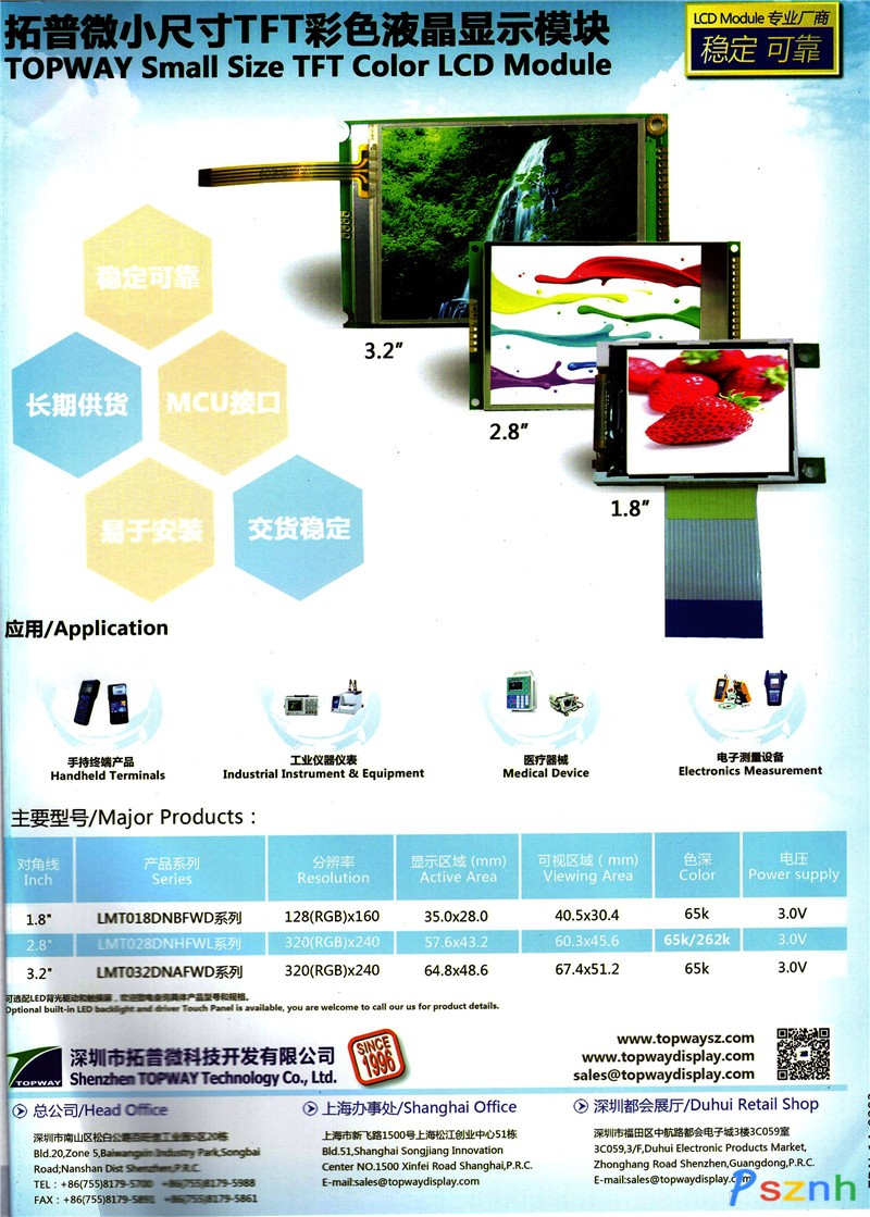 經(jīng)過多年的市場拓展,拓普微在工業(yè)類液晶顯示模塊市場已成為知名品牌,是日本、臺灣品牌的強有力競爭對手,并已成功進入國際市場多年,產(chǎn)品遠銷世界各地,主要客戶包括艾默生、東芝、通用電氣等國際知名企業(yè)。