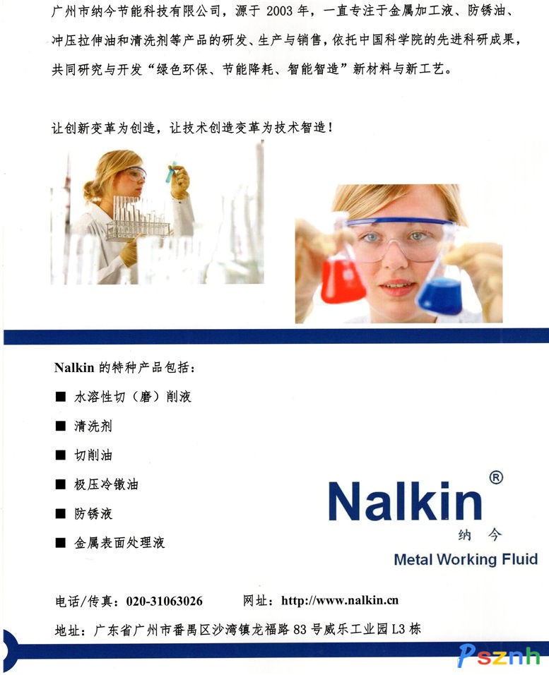 廣州市納今節能科技有限公司,成立于2003年,一直專注于工業潤滑、防銹油、沖壓拉伸油以及清洗等產品的研發,生產,銷售。積累了大量應用經驗和技術方案,提供多品種的高性能切削液、磨削液和清洗劑等產品,廣泛應用于機械加工、五金加工、表面處理等行業,為客戶提供全面的潤滑,防銹清洗等的解決方案,已發展成為先進的潤滑油供應商的領先者。 納今—您的專業服務型伙伴 我們作為一家技術領先的專業公司,為您提供最合適的的金屬加工液、防銹油和清洗劑,并把”您的滿意是我們唯一的標準“當做我們的工作指南針,今天及以后一直為您加油! 我們技術和性能 來源于德國的先進技術平臺,納今提供完整的高質量產品組合: * 乳化液 *微乳液 *半合成切削液 *全合成切削液 *防銹油 *沖壓拉伸劑 *常溫金屬清洗劑 *低溫金屬清洗劑 * 高溫金屬清洗劑 *低泡噴淋金屬清洗劑 我們的愿景 在質量和創新方面,我們一直致力于環保高性能的產品開發,與全球同步,能為客戶增加價值、顯著提高效果和降低環境影響。 納今的產品能夠滿足現在金屬加工與清洗的需要以及未來性能和法規的需求,也將會持續發展: *提供更高性能的潤滑、冷卻及防銹 *延長機械、刀具、設備的壽命 * 提高生產線效率 * 降低清洗溫度,節省能耗 *提高清洗速度,加快處理速度 *減少VOC排放 納今擁有豐富經驗的研發和技術支持團隊,專業的市場隊伍,并與中山大學、華南理工大學建立了緊密的科研合作關系,在金屬加工與清洗行業擁有專利,處于技術領先地位并為行業客戶提供可靠高效的服務。我們的追求是:不斷發展創新頂尖的產品和提高服務質量,為客戶提供可持續發展的空間并創造價值。