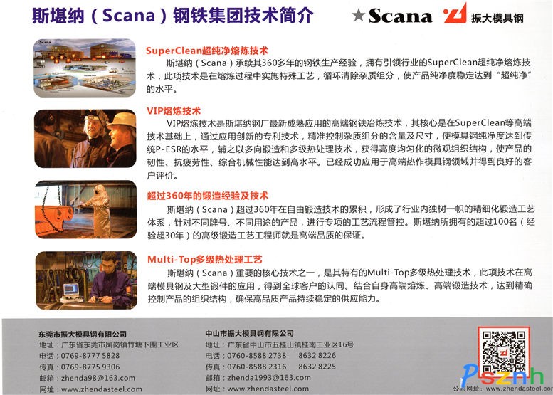 東莞市振大模具鋼有限公司成立于1993年。經(jīng)過20年的發(fā)展,振大成為模具鋼領(lǐng)域的領(lǐng)跑者。2014年1月,經(jīng)過瑞典斯堪納(Scana)鋼鐵公司半年的考核,振大公司獲得“Scana”這個(gè)世界頂級(jí)品牌工具鋼的首批廣東代理權(quán)。這是振大人多年來真誠付出的回報(bào),也是斯堪納對(duì)振大一直信奉“誠信經(jīng)營,物盡所用”價(jià)值觀的認(rèn)同。斯堪納與振大攜手同行,為中同客戶提供最優(yōu)的模具解決方案,共創(chuàng)美好未來。