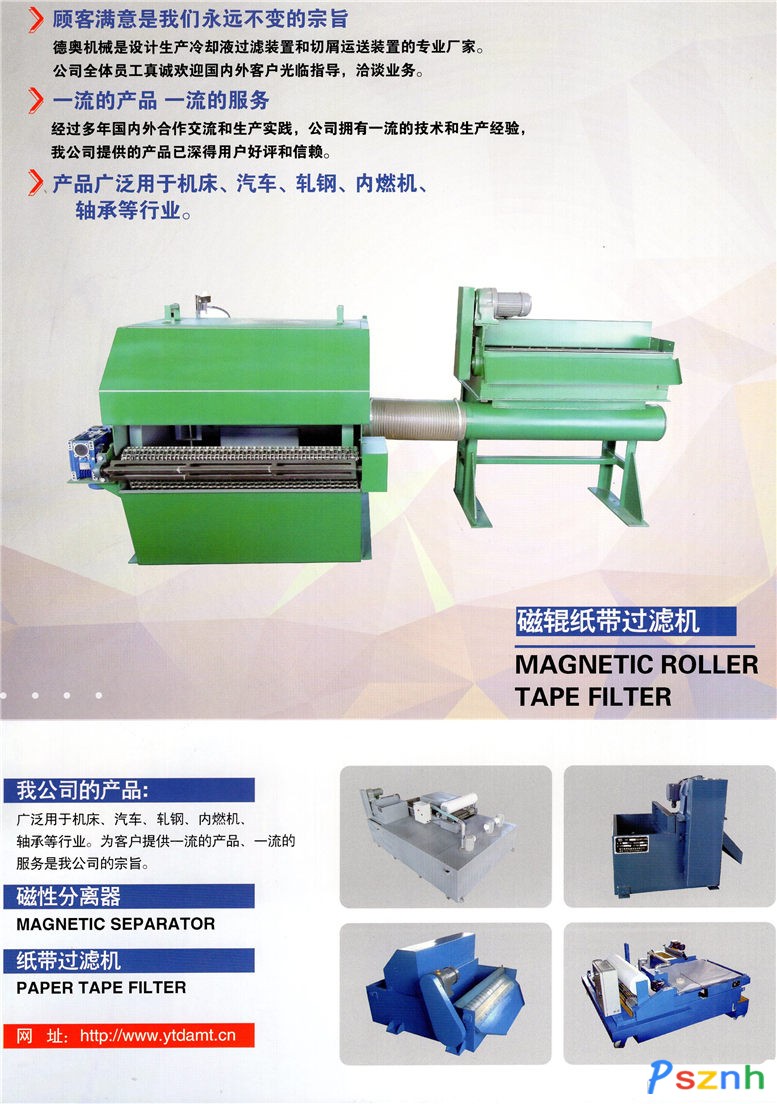 煙臺(tái)德奧機(jī)械設(shè)備有限公司 產(chǎn)品主要有:重力式紙帶過(guò)濾機(jī)、圓柱面磁性分離器、梳齒磁性分離器、鼓形紙帶過(guò)濾機(jī)、磁性排屑器、鏈板排屑器、刮板排屑器、旋流器、空氣真空紙帶過(guò)濾機(jī)、液體真空紙帶過(guò)濾機(jī)、預(yù)涂助濾過(guò)濾機(jī)、板式精密紙帶過(guò)濾機(jī)、磁棒分離器、反洗濾網(wǎng)筒式過(guò)濾機(jī)、螺旋排屑器、 盤式油水分離器、離心過(guò)濾機(jī)。是設(shè)計(jì)生產(chǎn)冷卻液過(guò)濾裝置和切悄運(yùn)送裝置的專業(yè)廠家。經(jīng)過(guò)多年國(guó)內(nèi)外合作交流和生產(chǎn)實(shí)踐,公司擁有一流的技術(shù)和生產(chǎn)經(jīng)驗(yàn),我公司 提供 的產(chǎn)品已深得用戶好評(píng)和信賴。