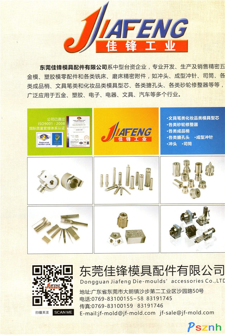 東莞佳鋒模具配件有限公司是一家臺商獨資對外加工企業,始創于1998年,主要生產經營五金模、塑膠模零件。幾年來,經過公司領導和全體員工的不懈努力,佳鋒公司取得了一定規模的發展,不論是產品種類,還是加工工藝、技術水平都有了很大的提高,完成了從簡單的沖壓模到復雜的塑膠模和高精度端子模的轉變;客戶群體也由沿海不斷地向內地深入,產品范圍覆蓋了五金、塑膠、電器、汽車、文具和化妝品等多個行業。