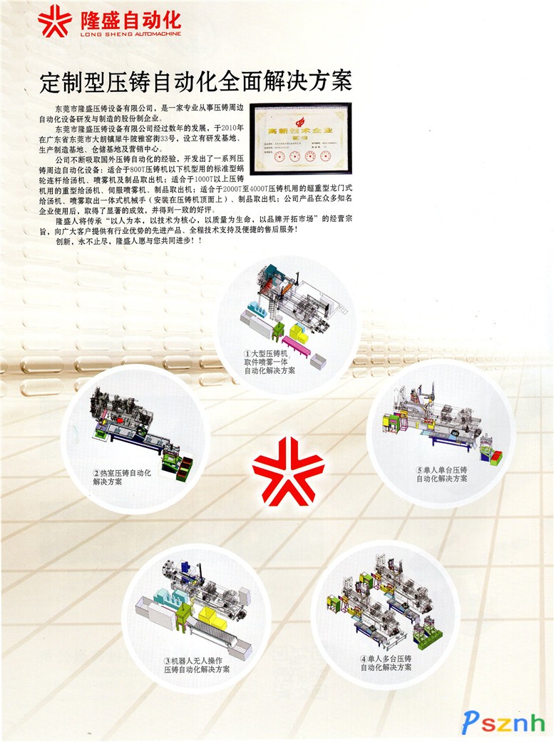 朗鎮犀牛陂雅窯街33號,設立有研發基地、生產制造基地、倉儲基地及營銷中心。公司不斷吸取國外壓鑄自動化的經驗,開發出了一系列壓鑄周邊自動化設備:適合于800T壓鑄機以下機型用的標準型蝸輪連桿給湯機、噴霧機及制品取出機;適合于1000T以上壓鑄機用的重型給湯機、伺服噴霧機、制品取出機;適合于2000T至4000T壓鑄機用的超重型龍門式給湯機、噴霧取出一體式機械手(安裝在壓鑄機頂面上)、制品取出機;公司產品在眾多知名企業使用后,取得了顯著的成效,并得到一致的好評。隆盛人將傳承“以人為本,以技術為核心,以質量為生命,以品牌開拓市場”的經營宗旨,向廣大客戶提供有行業優勢的先進產品、全程技術支持及便捷的售后服務!創新,永不止盡,隆盛人愿與您共同進步!