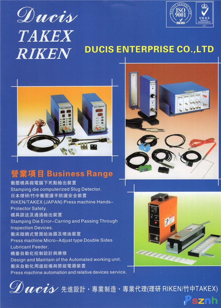 公司主要生產銷售微電腦下死點檢出器、模具誤送及通過檢出裝置、不銹鋼附自動電磁閥給油桶,雙面給油器,噴油器,自動化設備。代理之沖床護手防護安全裝置更是日本三大產品:理研光電產品、竹中之品牌、杉山之檢知器。
