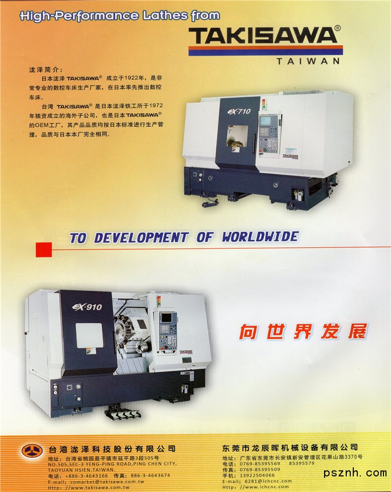 日本瀧澤(TAKISAWA)成立于1922年,是非常專業(yè)的數(shù)控車床生產(chǎn)廠家,全日本第一臺(tái)數(shù)控車床即由瀧澤推出,在車床領(lǐng)域有著自己非常專業(yè)和獨(dú)到的技術(shù)。 瀧澤公司于1972年獨(dú)資成立海外子公司臺(tái)灣瀧澤科技股份有限公司,主要從事瀧澤車床的組裝生產(chǎn)。臺(tái)灣瀧澤也是日本TAKISAWA的OEM工廠,其產(chǎn)品的品質(zhì)均按日本標(biāo)準(zhǔn)進(jìn)行生產(chǎn)管理,品質(zhì)與日本本廠完全相同。隨著近40年的發(fā)展和不斷創(chuàng)新,更有瀧澤人的不斷探索和奮斗,瀧澤CNC數(shù)控車床已成為亞洲車床業(yè)的第一品牌,產(chǎn)品行銷于世界各地,贏得客戶極好的口碑。