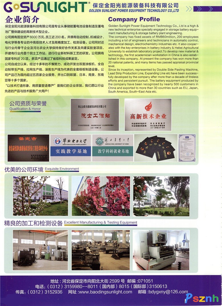保定金陽光能源裝備科技有限公司是專業(yè)從事儲(chǔ)能蓄電池設(shè)備制造及蓄電池廠整體建設(shè)的高新技術(shù)型企業(yè)。