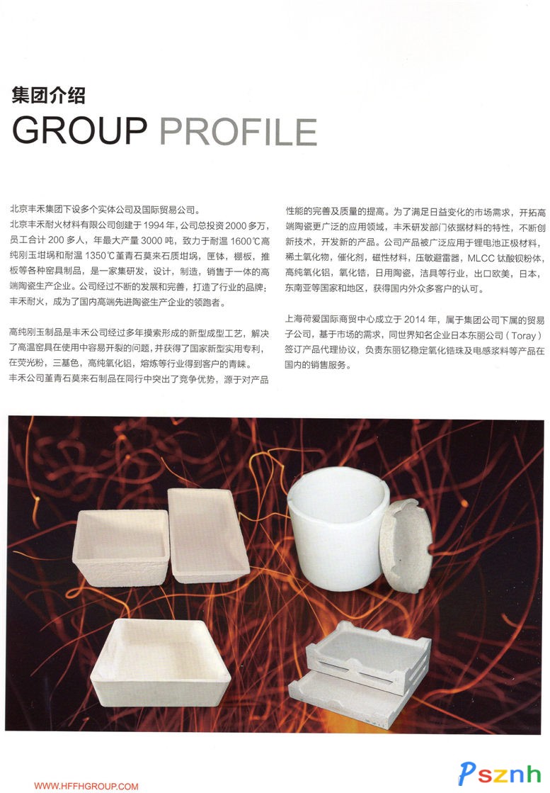 公司創(chuàng)建于1994年,坐落在北京市房山區(qū),擁有各種生產(chǎn)、試驗(yàn)、檢驗(yàn)設(shè)備,年產(chǎn)3000噸窯具制品。