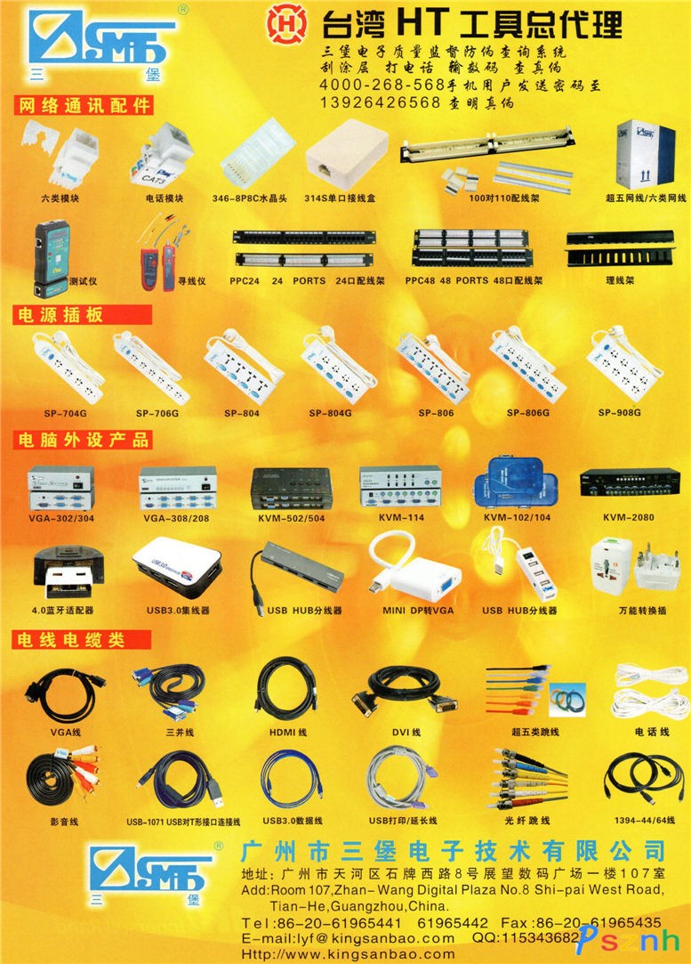 廣州市三堡電子技術有限公司源于1995年,由臺灣三堡電子股分有限公司,投資從事國內產品銷售事業部,并由臺灣三堡電子股分有限公司在國內所設立的工廠提供產品。主要產品包括綜合布線產品、電腦外設產品、電話配件、電線電纜、有線電視產品,同時并代理臺灣HT品牌電子手工具系列,歷經十余年的經營與革新。現在三堡電子連鎖式經營方式已成功在全國各地發展,在全國各地擁有許多經銷商,代理商及加盟店,同時隨時皆有新產品及新的進口代理,產品豐富。產品質量與品牌是三堡的核心價值,用戶安心是三堡的終極目標,與世界同步是創新的動力的