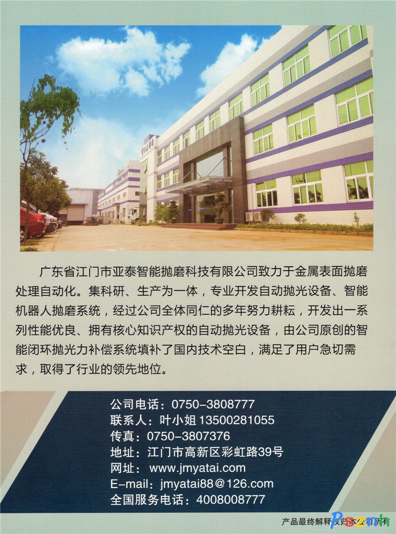 江門市亞泰智能拋磨科技有限公司致力于金屬表面處理自動化。集科研、生產為一體,專業開發自動拋光機及相配套的環保吸塵設備,經過公司全體同仁的多年努力耕耘,開發出一系列性能優良的表面處理設備:自動運輸式系列,自動圓盤系列,數控機械人系列,機械人,砂光機,自動砂光機系列等,填補了國內技術空白,適用于不銹鋼鍋,水龍頭,電水壼,豆漿機,手表外殼,鎖業配件,門把手,拉手,合頁,衛浴配件,五金配件,電子產品外殼等,適用圓型,平面型,橢圓型的銅、鐵、鋅、鋁,鎂,不銹鋼等工件均可,滿足了用戶的急切需求,取得了行業的領先地位。