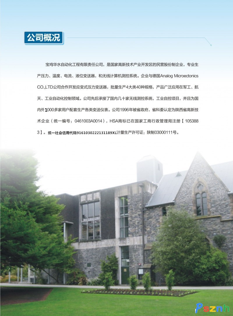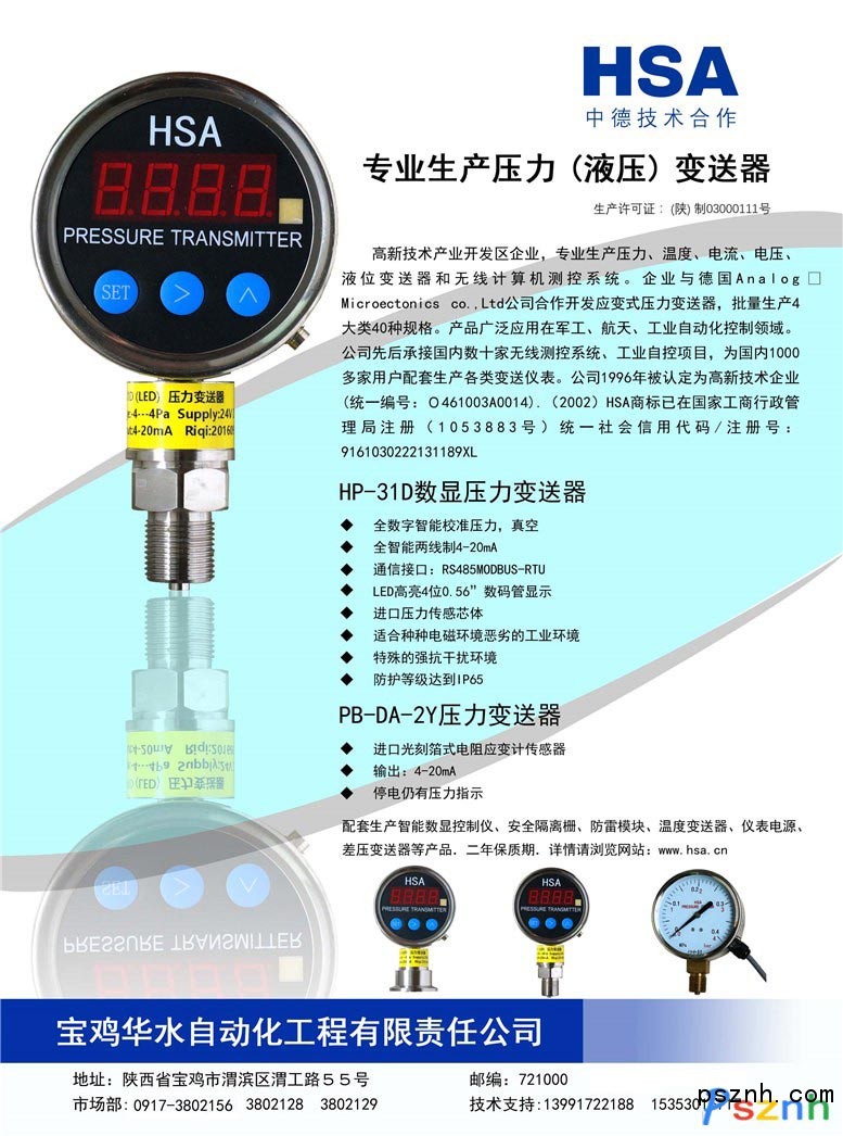 寶雞華水自動化工程有限責任公司是國家級高新技術產業開發區的民營股份制企業,專業生產壓力、溫度、電流、電壓、液位變送器,和無線計算機測控系統。企業與德國Analog Microectonics co.,Ltd公司合作開發應變式壓力變送器,批量生產4大類40種規格。