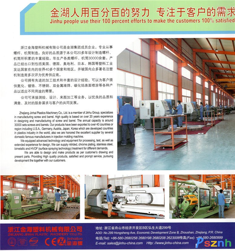 浙江金海塑料機(jī)械有限公司以人為本,以創(chuàng)新求發(fā)展。金湖集團(tuán)憑著其多年醞釀的獨特企業(yè)文化,以及企業(yè)對全球經(jīng)濟(jì)發(fā)展的熱切關(guān)注,以磅礴的氣勢和迅捷的反應(yīng)不斷壯大,使自己在本行業(yè)中深具規(guī)模,倍受矚目。集團(tuán)從事塑料機(jī)械制造長達(dá)27年之久,在上海、浙江設(shè)立了五個生產(chǎn)基地,擁有舟山金海機(jī)械有限公司、舟山金湖化纖機(jī)械有限公司、浙江金湖塑料機(jī)械有限公司、上海金湖擠出設(shè)備有限公司、上海金湖機(jī)械有限公司等十多家公司。總占地面積達(dá)900多畝,員工人數(shù)千余名,其中包括各類技術(shù)人員320多名,2003年實現(xiàn)產(chǎn)值5.3億元,2004年實現(xiàn)產(chǎn)值5.6億元,2005年實現(xiàn)產(chǎn)值5.7億元,2006年實現(xiàn)產(chǎn)值6.7億元。2002年出口500萬美元、2003年出口800萬美元、2004年出口1700萬美元、2005年出口3600萬美元、2006年出口5200萬美元。在公司員工的不斷努力下,公司先后獲得“中國民營企業(yè)500強(qiáng)”、“上海市百強(qiáng)民營企業(yè)”、“浙江省百強(qiáng)民營科技企業(yè)”、“浙江省誠信企業(yè)”、“中國輕工優(yōu)秀民營百強(qiáng)企業(yè)”、“中國機(jī)械優(yōu)質(zhì)產(chǎn)品”等榮譽(yù)稱號。此外,公司還擁有獨立的質(zhì)檢中心,并取得中國質(zhì)量協(xié)會質(zhì)量管理體系認(rèn)證其質(zhì)檢水平具有較高的權(quán)威性、公正性及可靠性。 2000年從德國引進(jìn)一條先進(jìn)的超音速高速離子噴涂設(shè)備和2臺螺桿加工中心,設(shè)備及螺桿料筒的加工采用數(shù)控機(jī)床及加工中心,保證了設(shè)備加工精度,螺桿料筒既有剛性又有韌性,從而大延了螺桿料筒的使用壽命。金湖集團(tuán)的主要產(chǎn)品有:各類塑料管道生產(chǎn)線;各類塑料異型材生產(chǎn)線;各類塑料板材、片材、流涎膜生產(chǎn)線;各種用途的單螺桿、雙螺桿擠出機(jī);各類塑料機(jī)械用螺桿、機(jī)筒;化纖卷繞頭及化纖成套生產(chǎn)設(shè)備;各類優(yōu)質(zhì)水環(huán)式真空泵,高可靠性水泵,熱油泵及液壓系統(tǒng),熱恒溫系統(tǒng);電工電纜機(jī)械;化工成套設(shè)備;齒輪減速箱等。產(chǎn)品遠(yuǎn)銷東南亞、中東、南美、歐共體等國家。在產(chǎn)品質(zhì)量上精益求精,在技術(shù)上不斷完善,在售后服務(wù)上建立了全國完善的網(wǎng)點服務(wù)體系,成為全國塑機(jī)行業(yè)中發(fā)展最快的、技術(shù)最強(qiáng)的優(yōu)秀企業(yè),深得用戶的好評。我們的優(yōu)勢在于不斷為用戶提供優(yōu)質(zhì)、可靠、價格合理的新產(chǎn)品,幫助用戶創(chuàng)造最大的利潤和商機(jī)是我們最終的目標(biāo)。