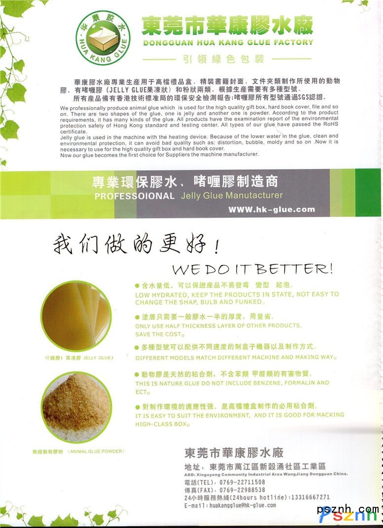 東莞市萬江華康膠水廠專業致力于生產適用于高檔禮品盒、精裝書籍封面、文件夾類制作所使用的動物膠。我們的產品分啫喱膠(Jelly Glue 果凍狀)和動物膠粉兩種,根據客戶生產需要有多種型號。  我們同時還銷售高質量的骨膠和工業明膠產品。 東莞華康堅決打擊偽劣動物膠產品。      所有產品備有香港技術標準局的環保安全檢測報告;啫喱膠所有型號通過SGS認證.     我們啫喱膠用于帶有加溫裝置的機器,由于含水量很低,可以有效防止產品出現變形、起泡、發霉等不良現象,使用涂層只需要一般膠水厚度的一半,是制作高檔禮品盒、精裝書籍封面等產品的必用膠。華康品牌的動物膠目前在國內有多家大型工廠使用,并且出口東南亞以及中東地區,配供日本、德國和意大利的自動和半自動制盒機器,以及國產各類帶有加溫裝置的制盒機器。     華康所生產的各類型號的啫喱膠已經成為國內多家機器制造商首選試機膠水。    我們同時義務提供相關的制作技術服務和相關的制作機器以及易損件、輔料的供應。     我們還可以為KOLBUS-DA36、上海紫宏HSK-30書殼機器做多功能改裝(改裝做圓角、增加推板數量);同時提供禮品盒生產線、成套二手精裝設備,機械維修以及操作人員的培訓.