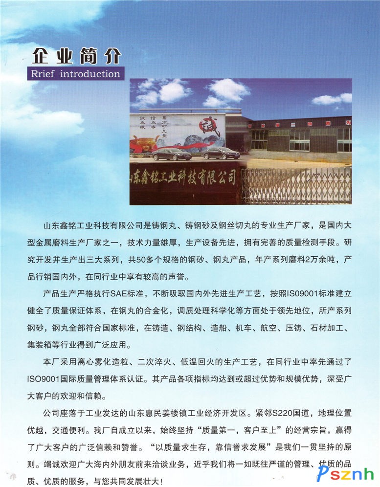 山東鑫銘工業科技有限公司是鑄鋼丸、鑄鋼砂及鋼絲切丸的專業生產廠家,是國內大型金屬磨料生產廠家之一,技術力量雄厚,生產設備先進,擁有完善的質量檢測手段。研究開發并生產出三大系列,共50多個規格的鋼砂、鋼丸產品,年產系列磨料6萬余噸,產品行銷國內外,在同行業中享有較高的聲譽。     產品生產嚴格執行SAEJ444標準,不斷吸取國內外先進生產工藝,按照ISO9001標準建立健全了質量保證體系,在鋼丸的合金化,調質處理科學化等方面處于領先地位,所產系列鋼砂,鋼丸全部符合國家標準,在鑄造、鋼結構、造船、機車、航空、壓鑄、石材加工、集裝箱等行業得到廣泛應用。     本廠采用離心霧化造粒、二次淬火、低溫回火的生產工藝,在同行業中率先通過了ISO900l國際質量管理體系認證。其產品各項指標均達到或超過SAEJ444標準要求,并擁有完善的質量檢測體系和手段。目前,公司具備技術領先優勢和規模優勢,深受廣大客戶的歡迎和信賴。     本廠座落于山東省惠民縣姜樓工業園。緊鄰濟220國道,地理位置優越,交通便利。我廠自成立以來,始終堅持"質量第一,客戶至上"的經營宗旨,贏得了廣大客戶的廣泛信賴和贊譽。 "以質量求生存,靠信譽求發展"是我們一貫堅持的原則。     竭誠歡迎廣大海內外朋友前來洽談業務,今后我們將一如既往 以嚴謹的管理、優良的品質、優質的服務,與您共同發展壯大。