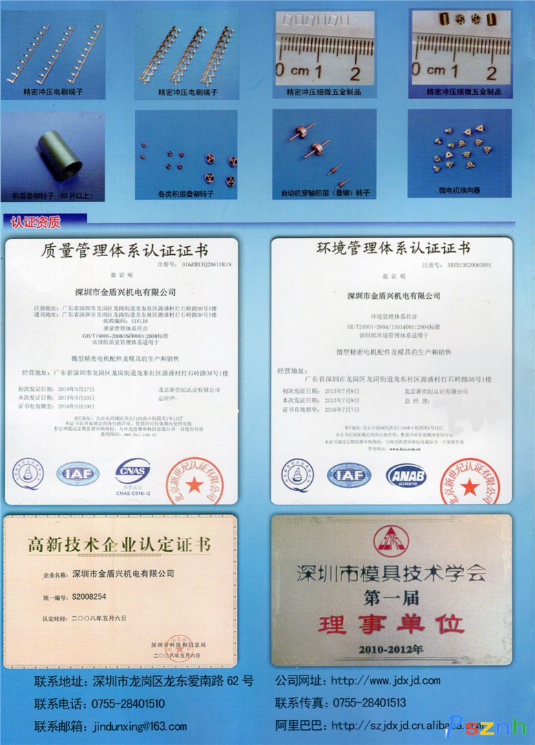 深圳市金盾興機電有限公司,十幾年來專業致力于精密模具零配件加工,公司擁有日本沙迪克慢走絲(油割機2部)、沙迪克慢走絲(水機4部)、有多部CNC數控、精密磨床、精密銑床等加工設備;有二次元、投影儀、工具顯微鏡、硬度檢測儀等先進的檢測儀器。并提供多行業產品生產自動化解決方案,目前已成功為多家企業研發自動化生產設備,解決客戶用人多,效率低,成本高,管理難諸多問題。公司的沖壓部門在微電機配件行業市場上有一定的影響及口碑。公司擁有進出口經營權,直接參與國際化競爭,通過并有力執行IS9001:2008質量管理體系,及14001環境管理體系。優秀員工素質,優惠產品價格和完善配套的售后服務,在客戶樹立優秀企業形象。