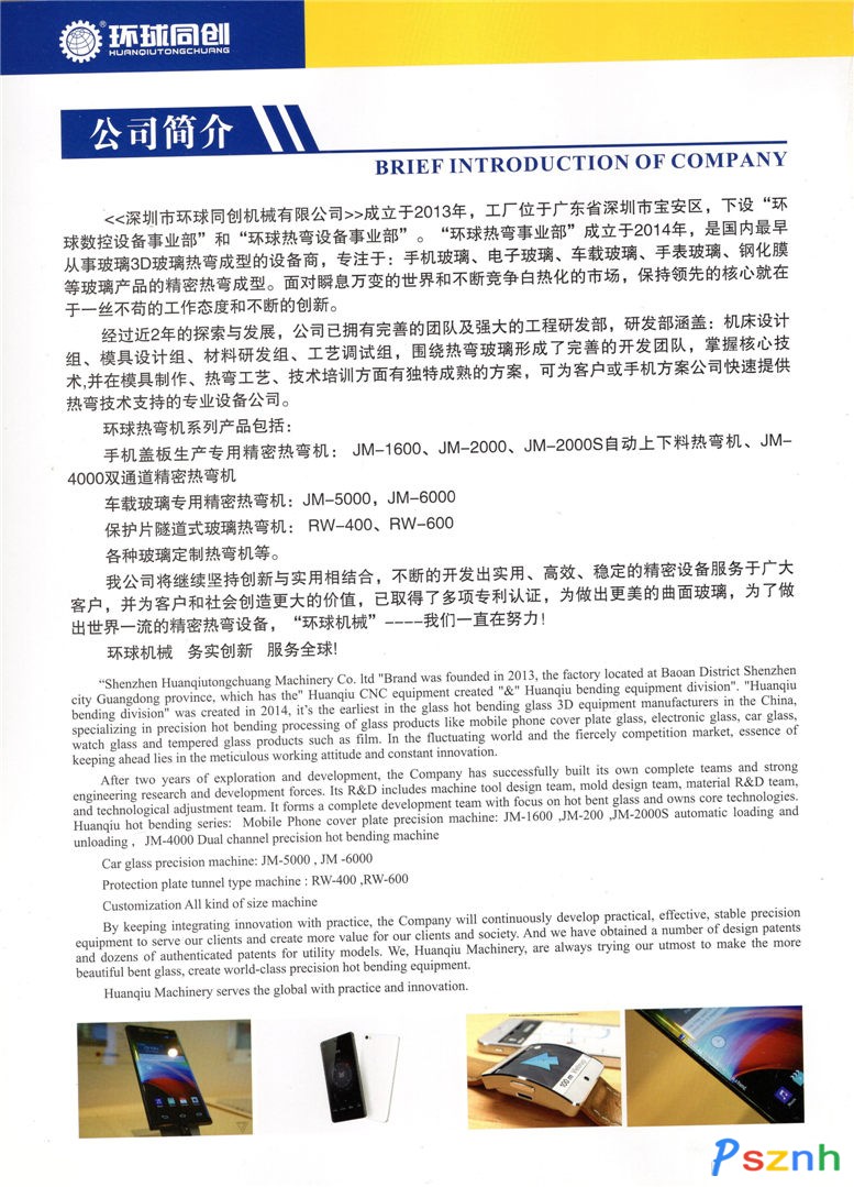 深圳市環球同創機械有限公司成立于2013年,工廠位于廣東省深圳市寶安區,下設“環球數控設備事業部”和“環球熱彎設備事業部”。“環球數控設備事業部”成立于2013年,是專注于精密3C行業零件加工,研發、生產與銷售一體的高新科技企業,專注于:各種精密玻璃加工、各種金屬零件高光銑削加工、精密陶瓷加工等 ,憑借著超過多年的行業累積經驗和團隊努力,旗下品牌“HUANQIU”---環球機械,在手機面板制造、觸摸屏玻璃加工、精密機械零件制造等領域內有著成熟的產品和解決方案,并成為行業的創新者和實踐者. Is focused on the machining precision of 3C industry, research and development, production and sales of high-tech enterprises, focusing on: all kinds of precision glass processing, various me