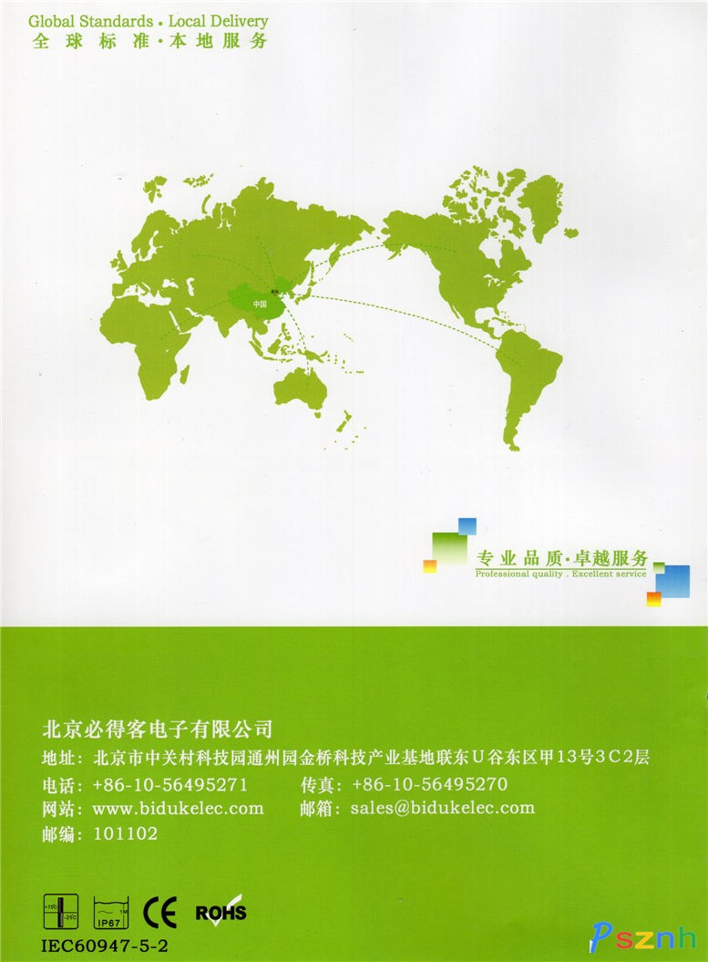 北京必得客電子有限公司 Biduk做為歐美一些知名品牌OEM生產制造商,多年來始終致力于生產、研發工業自動化領域電感式傳感器、電容式傳感器、光電式傳感器等工控產品。產品研發與生產嚴格按照IEC國際標準來設計與控制,至今已匯聚具有豐富傳感器經驗高科技人才,先進的生產工藝和完善的檢測設備,嚴格按照ISO9001質量管理體系要求進行管理,產品已通過嚴格的EMC(電磁兼容性)、IP防護等級、振動沖擊、高低溫等國際標準測試并通過歐盟CE認證和ROHS檢測。  公司擁有十幾個系列數千種不同種類規格功能產品。如今在專業領域內,公司產品和服務的廣度和深度深得客戶親賴,業務范圍也隨之擴及全球。我們的足跡遍布世界航空航天、鐵路、港口、冶金、礦山、機床、紡織、電梯、石油化工、印刷、包裝、食品、建筑、汽車、等行業。為客戶提供國際標準的多種類接近傳感器和多方位快捷的技術服務支持。