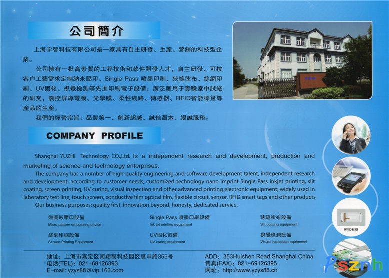 上海宇智科技有限公司可按客戶工藝需求定制納米壓印、Single Pass 噴墨印刷、狹縫涂布、絲網印刷、UV固化、視覺檢測等先進印刷電子設備;  廣泛應用于實驗室中試線的研究,觸控屏導電膜、光學膜、柔性線路、傳感器、RFID智能標簽等產品的生產。     我們的經營宗旨:品質第一、創新超越、誠信為本、竭誠服務。