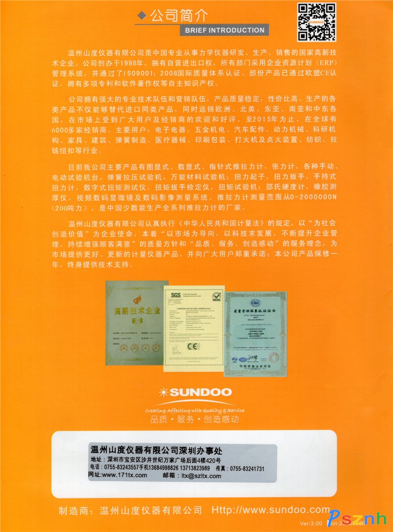 溫州山度儀器有限公司是中國專業(yè)從事力學儀器研發(fā)、生產、銷售的國家高新技術企業(yè)。公司創(chuàng)辦于1998年,擁有自營進出口權,所有部門采用企業(yè)資源計劃(ERP)管理系統(tǒng),并通過了ISO9001:2008國際質量體系認證。部分產品已通過歐盟CE認證,擁有多項專利和軟件著作權等自主知識產權。