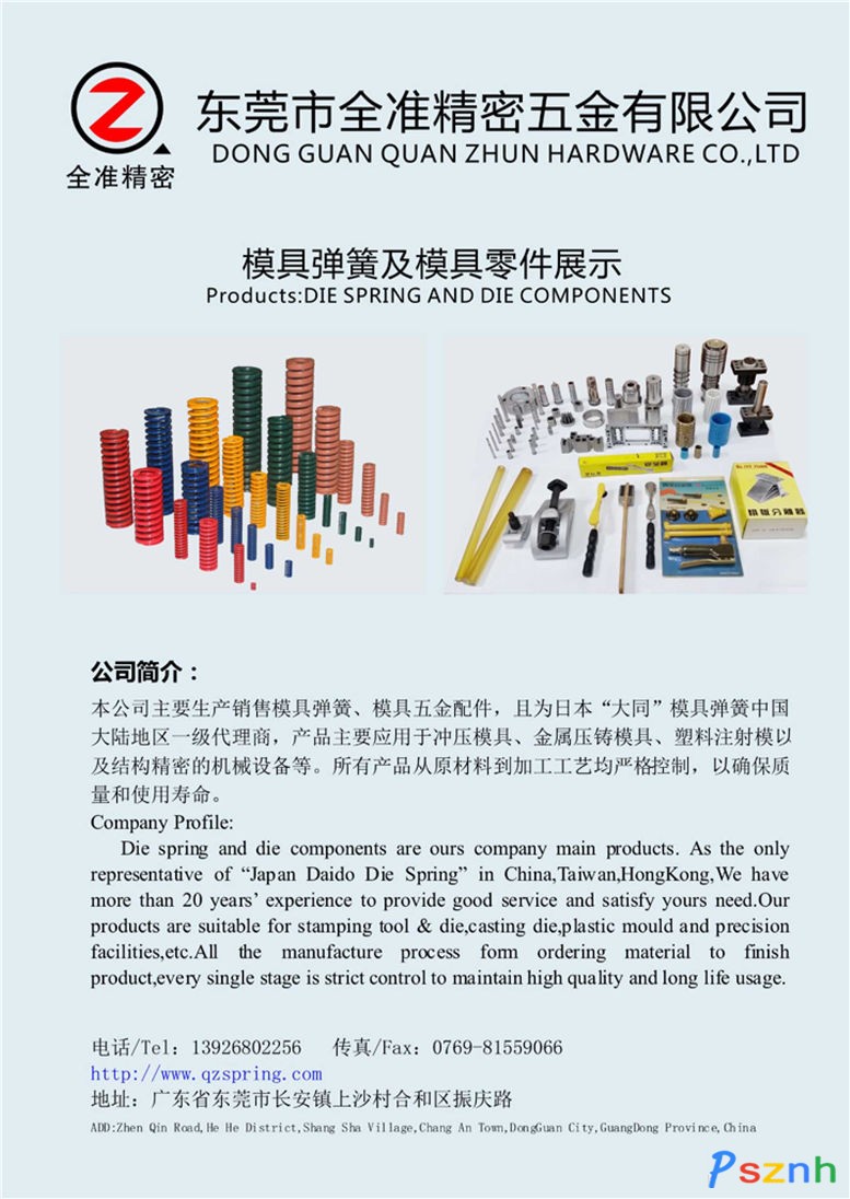 東莞市全準精密五金有限公司主營國產、進口模具彈簧及模具五金配件,產品主要應用于沖壓模具、金屬壓鑄模具、塑料注射模以及結構精密的機械設備等。2007年取得“三A”模具彈簧銷售總代理,2009取得日本“大同”模具彈簧中國大陸地區一級銷售代理資格,2013年引進臺灣的技術與設備,開始自行生產“機元”牌模具彈簧,均選用優質50CrVA、55CrSi等油淬火制作,經三次以上強壓及表面強化處理,耐疲勞、耐溫度、韌性好,質量達到國內頂尖水平,且每批次均經過疲勞測試以確保其使用壽命。歡迎廣大新老客戶垂詢!  本公司的主營產品:大同彈簧,機元彈簧  企業名稱:東莞市全準精密五金有限公司 品牌名稱:大同彈簧 所在地:廣東省 東莞市 全市 廣東省東莞市長安鎮上沙村合和區振慶路.