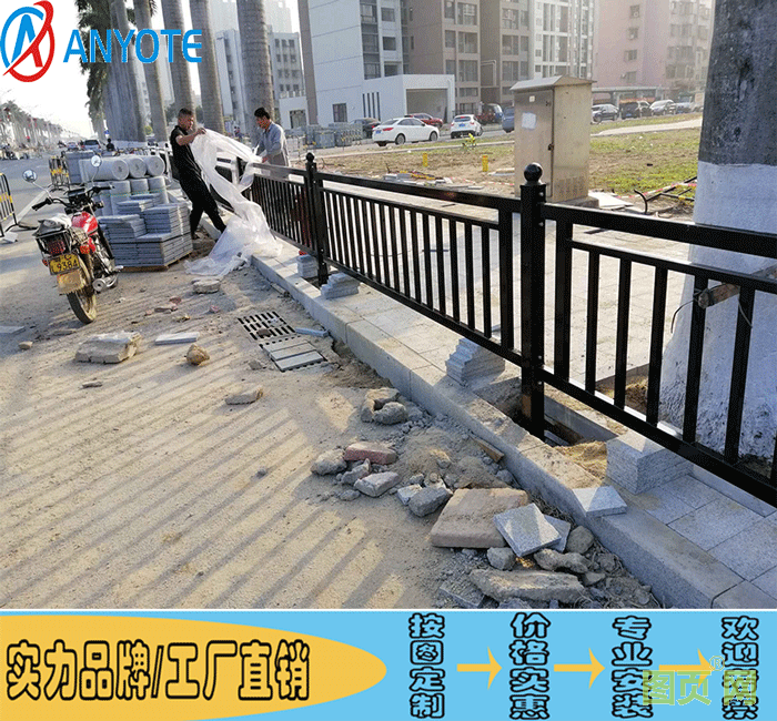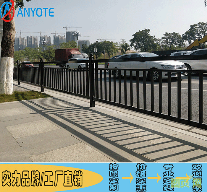 市政鐵藝護欄特點:具有輕盈、美觀、實用;網片與網柱連接十分緊湊,整體感好;隔離性能好,底座使用水泥墩