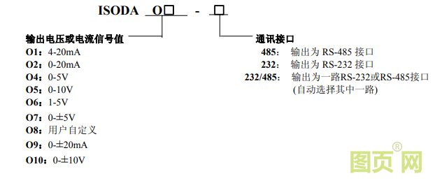 選型舉例 2: 型號:ISODA O4-232 表示 0-5V 信號輸出,輸出為 RS-232 接口
