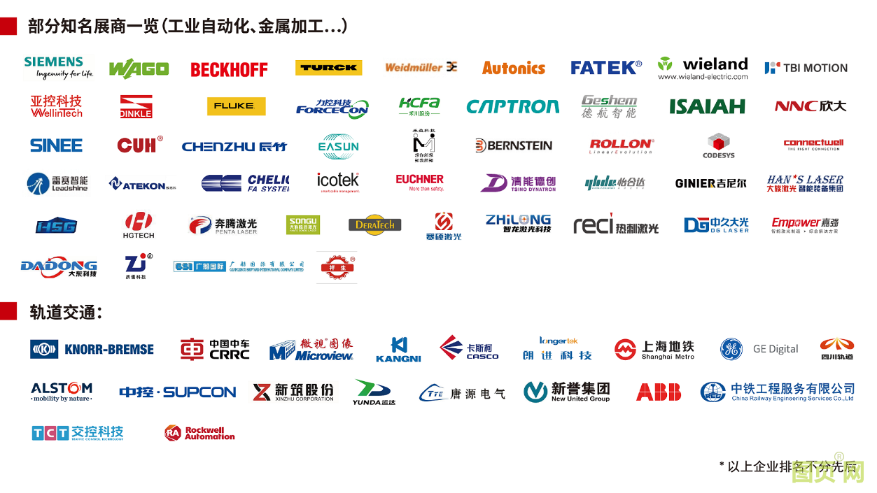 軌道交通展展:地鐵、輕軌和鐵路機(jī)車車輛及配件、內(nèi)飾;地鐵、輕軌和鐵路交通規(guī)劃及設(shè)計(jì);車輛制動(dòng)系統(tǒng)、傳動(dòng)系統(tǒng)、車門(mén)系統(tǒng)、照明系統(tǒng)、自動(dòng)駕駛系統(tǒng)、其他系統(tǒng);軌道交通供電系統(tǒng);鐵路投資及軌道運(yùn)營(yíng)單位;隧道及地下工程施工技術(shù)及設(shè)備,建設(shè)工程材料、防水材料;信息和自動(dòng)化技術(shù)、通信信號(hào)技術(shù)的應(yīng)用;原材料及其他工具類;車站運(yùn)營(yíng)維保服務(wù)及配套設(shè)施;軌道安防技術(shù)及設(shè)備;檢測(cè)儀器與技術(shù)認(rèn)證;軌交監(jiān)控、人工智能;五金工具;基礎(chǔ)設(shè)施建設(shè)及配套