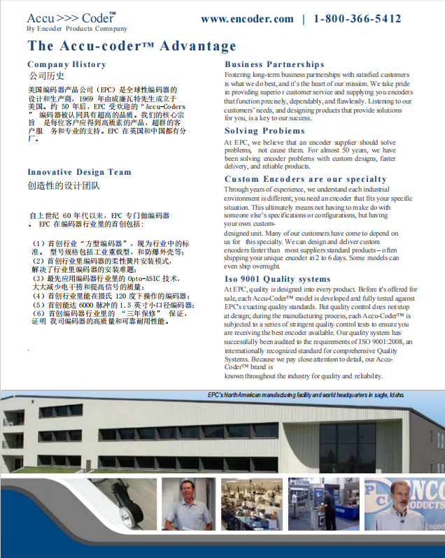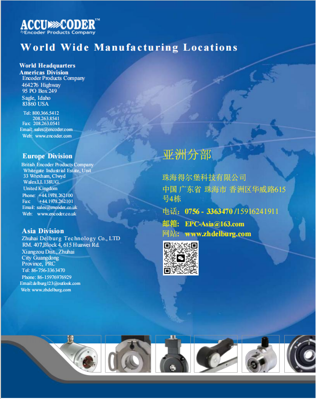 EPC (Encoder Products Company) 編碼器產品公司成立于1969年,是一家全球性的光電編碼器生產商,生產全套的編碼器為廣大工業用戶服務。EPC的編碼器產品被廣泛應用于:伺服和步進電機的驅動控制,運動、位置和速度控制和反饋,電子計數器,自動化機器及工具,車床、磨床和CNC機器,裝配、包裝、切割及輸送設備,轉床和傳送帶,電梯控制和堆料機,數碼彩繪機和醫療儀器等等。EPC在英國亦有分廠,負責歐洲的生產、銷售。